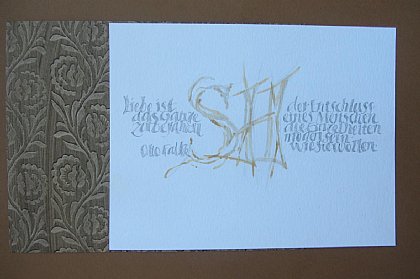 Alle Arbeiten werden ausschließlich mit Tinte und Stahlfeder bzw Kiel- oder Schilfrohrfeder auf Papier oder Pergament per Hand geschrieben. Die richtige Schrift und das besondere Material verleihen den Werken den exquisiten Ausdruck! Gerne schreibe ich natürlich auch Namen auf vorgedruckten Einladungen!
